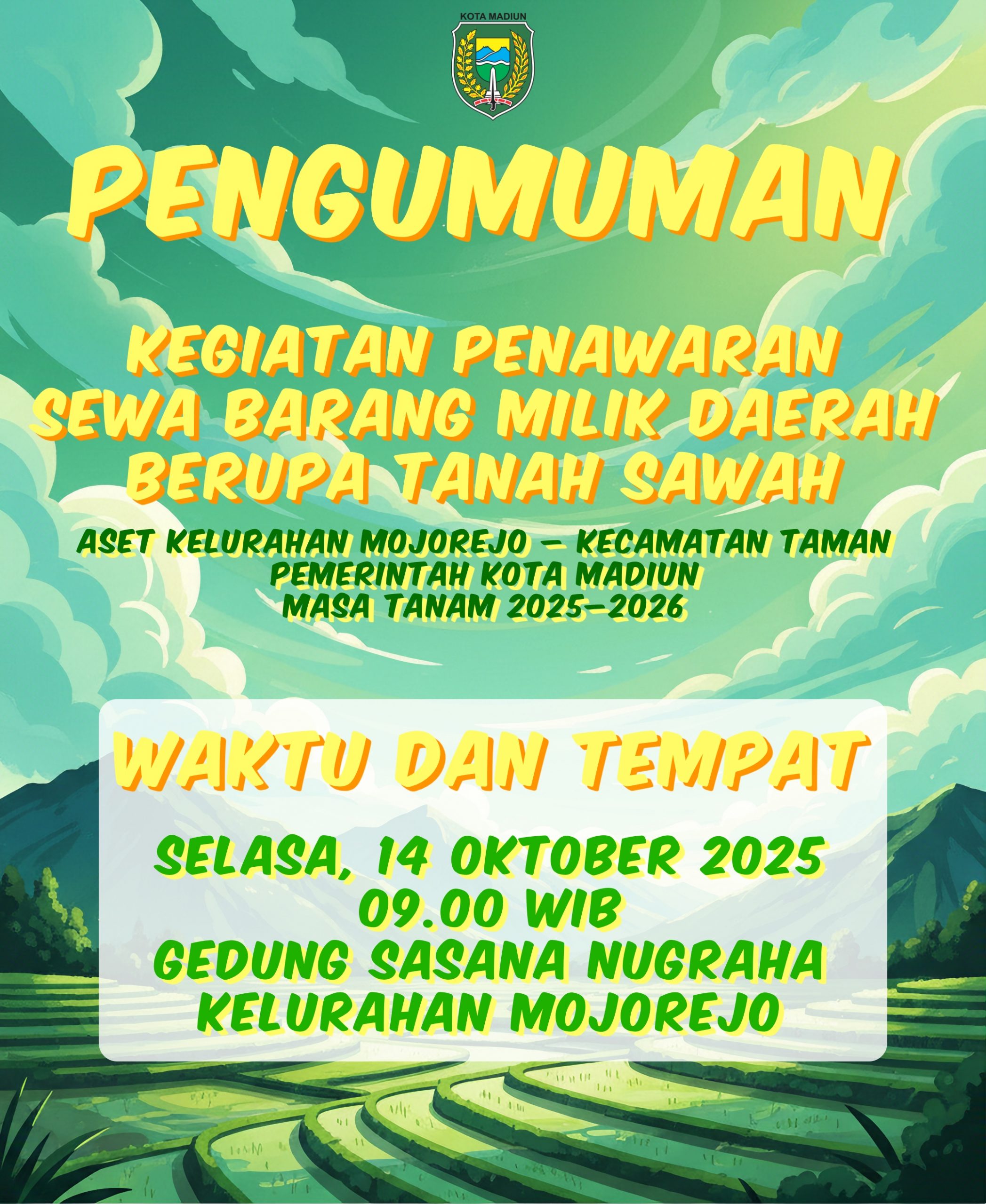 Pemerintah Kota Madiun melalui Kelurahan Mojorejo Kecamatan Taman membuka penawaran sewa tanah sawah milik daerah untuk masa tanam 2025–2026 ? ? Selasa, 14 Oktober 2025 […]